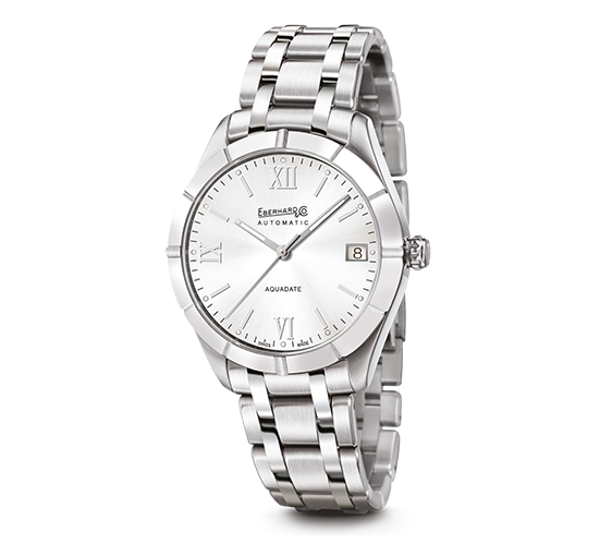 Gli orologi Aquadate fanno parte delle collezioni Eberhard & Co. dagli anni ’60: una linea di modelli automatici con una personalità eclettica. Oggi la Maison propone una versione contemporanea con dimensioni generose e un aspetto raffinato: Aquadate Grande Taille. La cassa in acciaio, con finitura satinata e lucida, ha un diametro di 41 mm ed è proposta con lunetta in acciaio satinato o lucido. Il modello è disponibile in diverse versioni di quadranti, a seconda del tipo di lunetta a cui è abbinato. Aquadate Grande Taille è impermeabile fino a 100 metri e ha un fondello fissato da 8 viti personalizzato con incisioni. Il look del modello è completato da un bracciale Charme in acciaio con finitura satinata e lucida.
