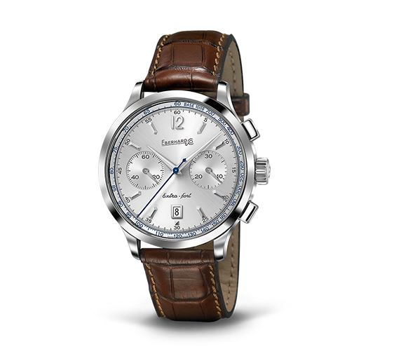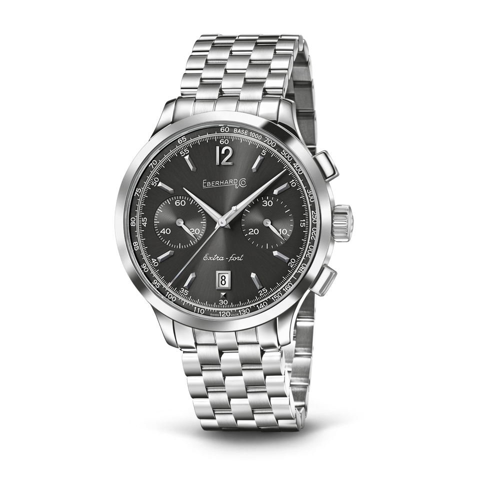 Cadran noir. Compteurs argentès avec finition azurée, 12 en chiffre arabe, index en applique.