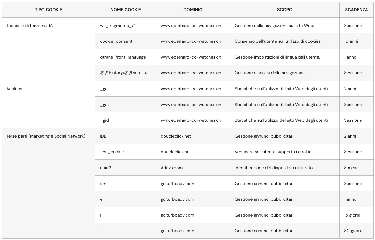 Di seguito l’elenco dei cookie presenti sul sito Web di EBERHARD & Co. Per quanto riguarda i “cookie di terze parti”, una descrizione dei singoli cookie e del trattamento che ne viene fatto è reperibile consultando l’indirizzo Web riportato nella colonna “Dominio”.