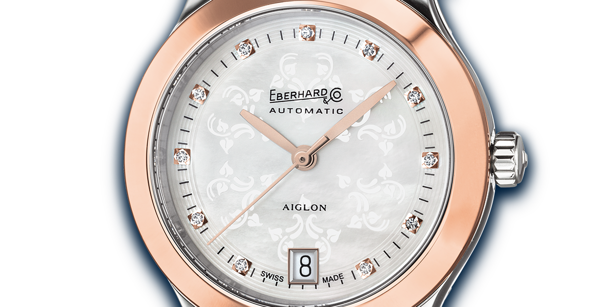Quadrante bianco in madreperla con delicato motivo floreale nella parte centrale.