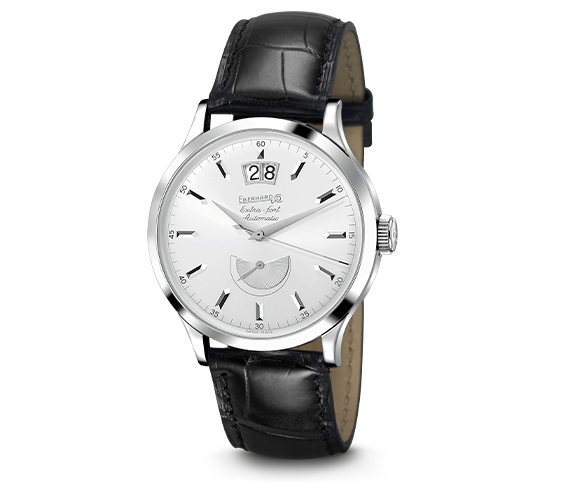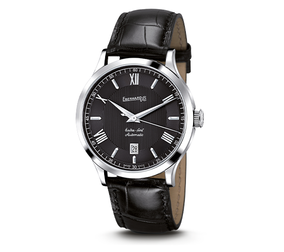 Quadrante grigio, con “12” arabo e indici in applique, rodiati.