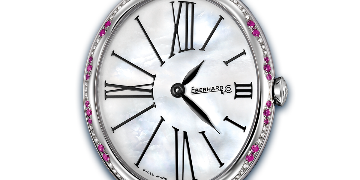 QUADRANTE BIANCO IN MADREPERLA CON INDICI E NUMERI ROMANI STILIZZATI DALLA LINEA SOTTILE AD ORE 3, 6, 9 E 12.