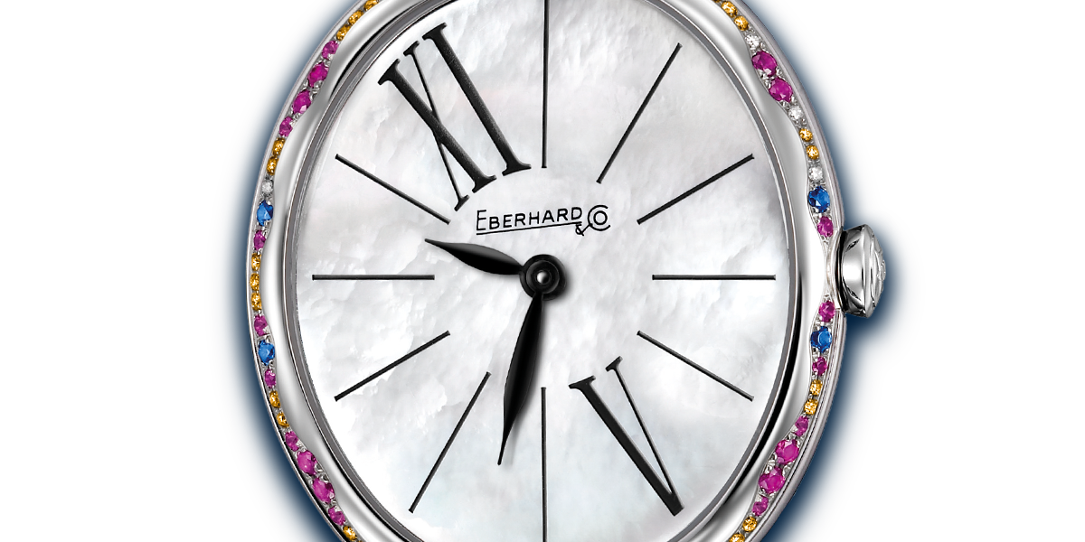 QUADRANTE BIANCO IN MADREPERLA CON SOTTILI INDICI E NUMERI ROMANI STILIZZATI A ORE 5 E ORE 11.