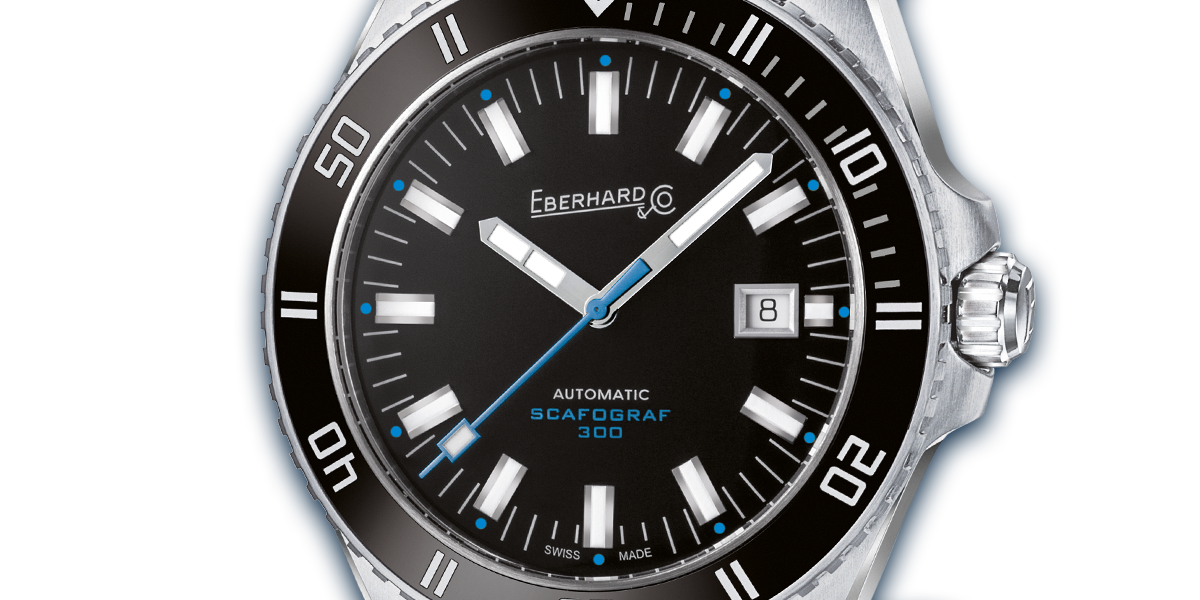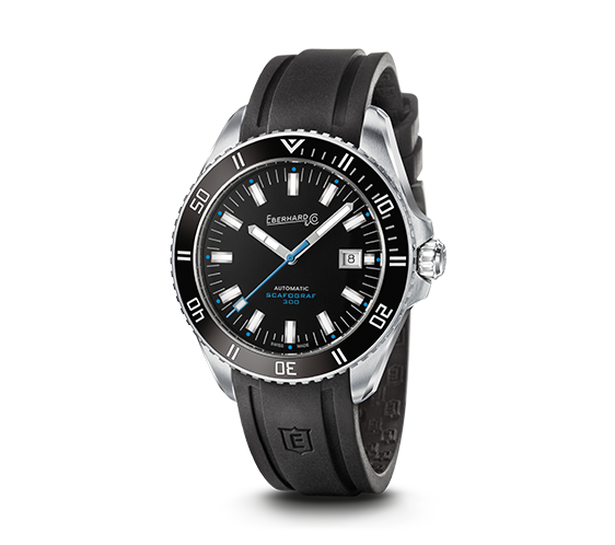 Quadrante nero con finitura matt, “galbé” con dots blu e indici applique luminescenti.