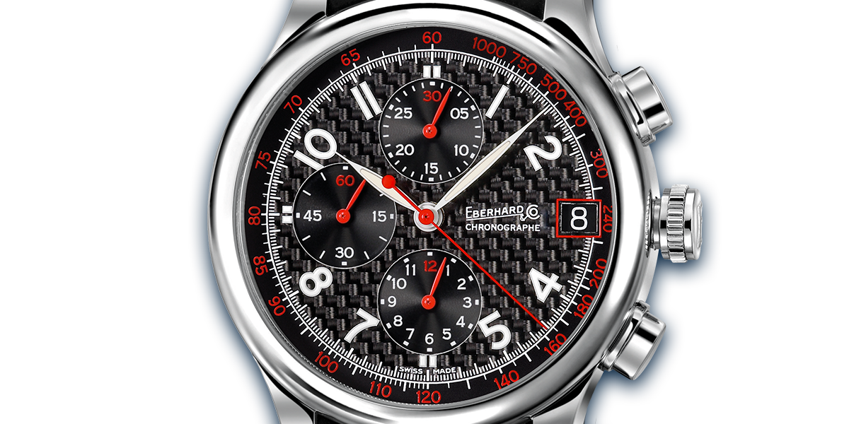 Quadrante nero in fibra di carbonio, profilo esterno opaco, contatori con lavorazione “azurée”.